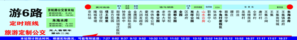 游6路始發(fā)點(diǎn)為京杭路公交調(diào)度站,終點(diǎn)站在宿城區(qū)王集鎮(zhèn)朱海水庫度假區(qū),全程約32公里,共設(shè)置了35個(gè)站點(diǎn),單程票價(jià)為2元,可享受城市公交刷卡等優(yōu)惠政策。運(yùn)行時(shí)間為早上6:40至晚上18:00,線路采取定點(diǎn)發(fā)班,班次間隔約為50分鐘,后續(xù)將視客流情況調(diào)整運(yùn)營班次及發(fā)車間隔。