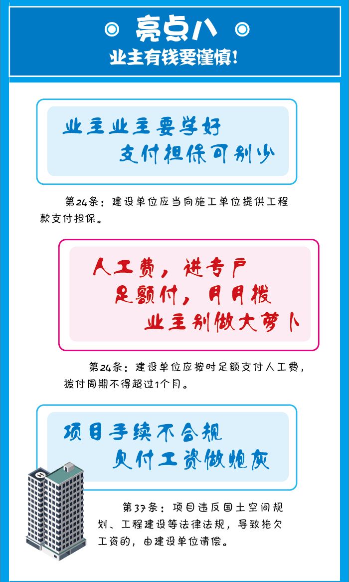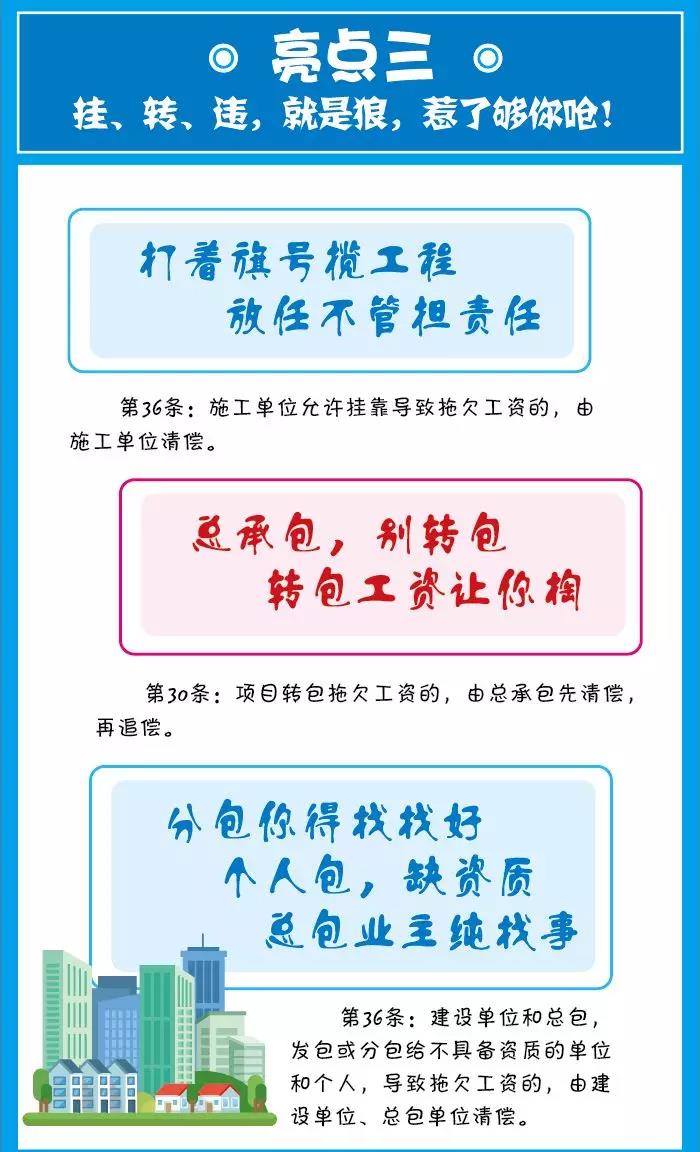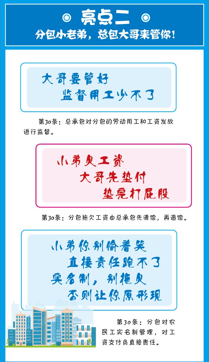 該條還規(guī)定了總包單位對分包單位的用工和工資發(fā)放進(jìn)行監(jiān)督的責(zé)任,這跟之前的總包單位單純的收取配合費(fèi)而對放任分包單位的用工及工資發(fā)放。這也為保障農(nóng)民工能切實拿到工資提供了法律依據(jù)。