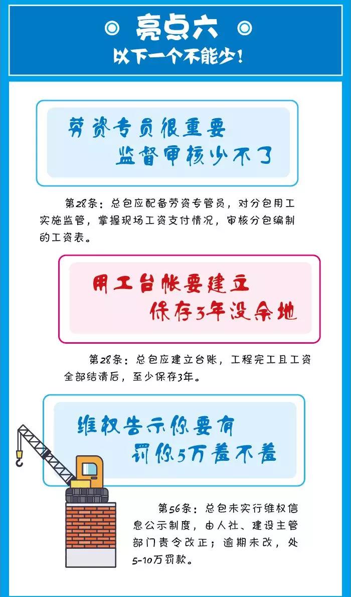 上述規(guī)定確立了總包對分包的用工及工資支付進(jìn)行監(jiān)督管理的責(zé)任,總包及分包均應(yīng)當(dāng)建立管理臺帳,并予以保存。農(nóng)民工維權(quán)信息指示牌要在工程項目中進(jìn)行展示,要明確告知農(nóng)民工的的維權(quán)途徑,否則要被處以相應(yīng)的罰款。