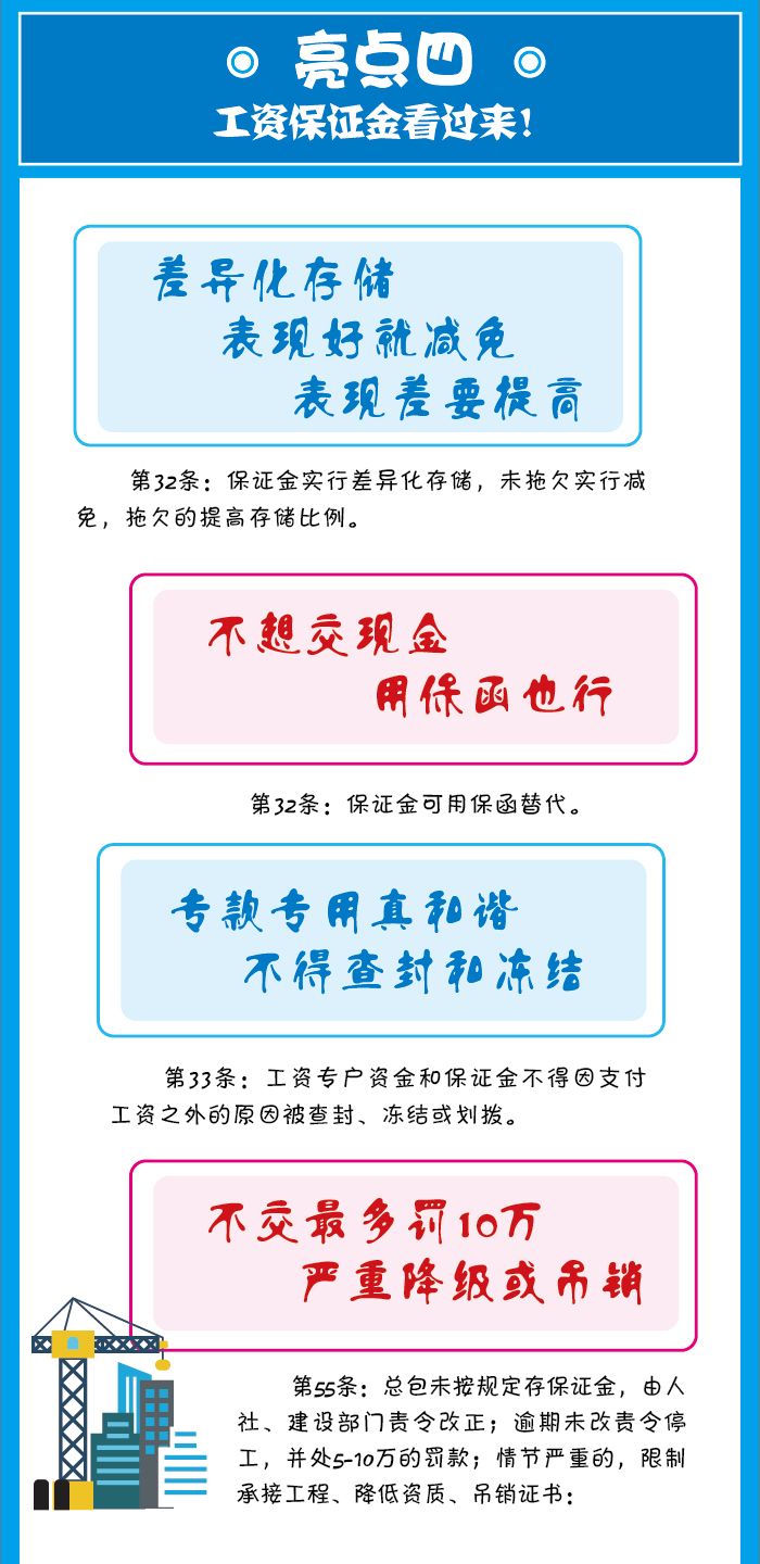 為切實保障總包能代發(fā)工資,《條例》規(guī)定其要存儲一定的工資保證金,工資保證金的數(shù)額施行差異化存儲,未拖欠單位的比例降低,拖欠的提高比例。該工資保證金也可用金融機(jī)構(gòu)的保函代替,要注意此處是金融機(jī)構(gòu)的保函,不是普通的擔(dān)保公司的保函。