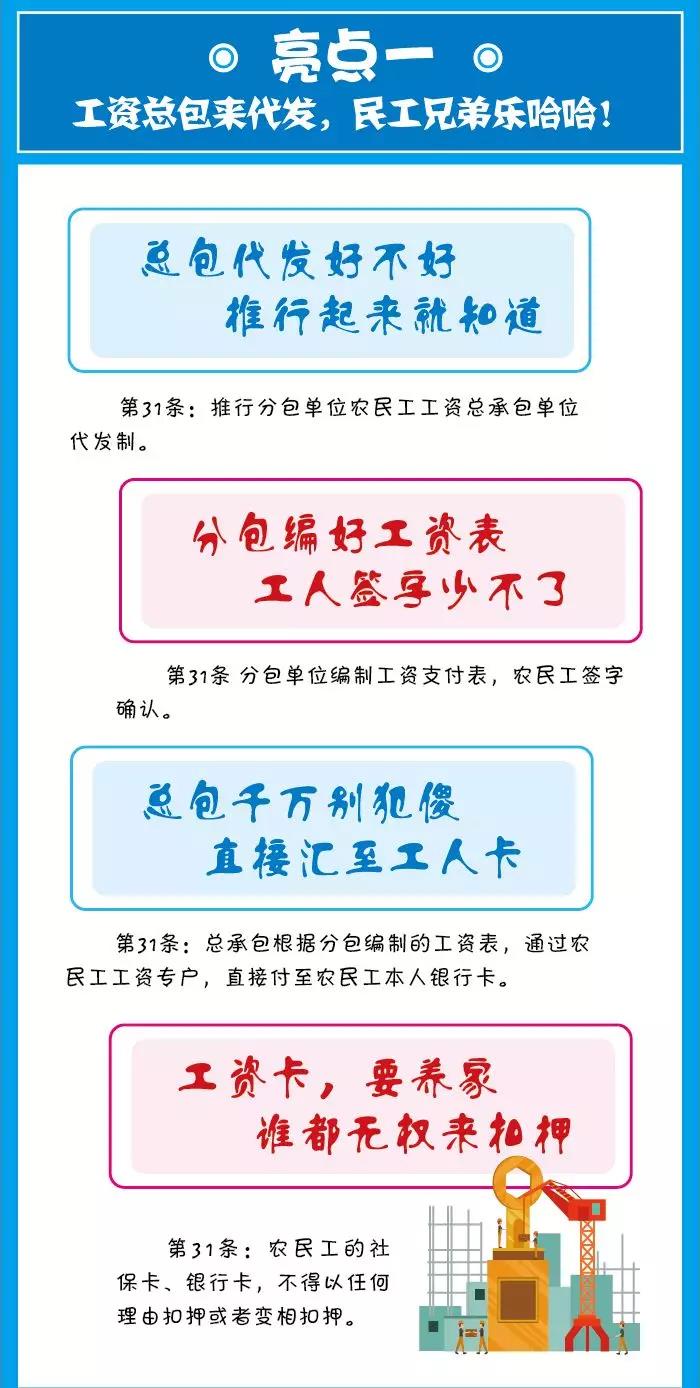 該條規(guī)定了總承包單位代分包單位發(fā)放分包單位所招用的農(nóng)民工的工資,分包單位每月要將農(nóng)民工簽字確認(rèn)的工資表交給總包,總包直接將工資發(fā)放到農(nóng)民工的工資卡里面,也就是說總包要將工資單獨拎出來由其對外直接予以發(fā)放,不再由分包單位發(fā)放,這樣可以確保農(nóng)民工能實實在在的拿到工資,而且任何單位和個人均不得扣押農(nóng)民工的工資卡,條例也規(guī)定了對扣押工資卡的處罰措施。