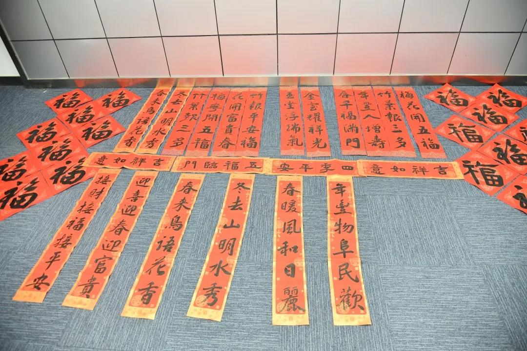 “無聯(lián)不成春,有聯(lián)春更濃”。活動現(xiàn)場,一幅幅飽含吉祥寓意的春聯(lián)、一個個“福”字逐漸鋪滿兩邊的桌子和地上。行、隸、小篆等多種書體各顯神韻,滿場墨香包含著大家濃濃的祝福和對新年的期盼。