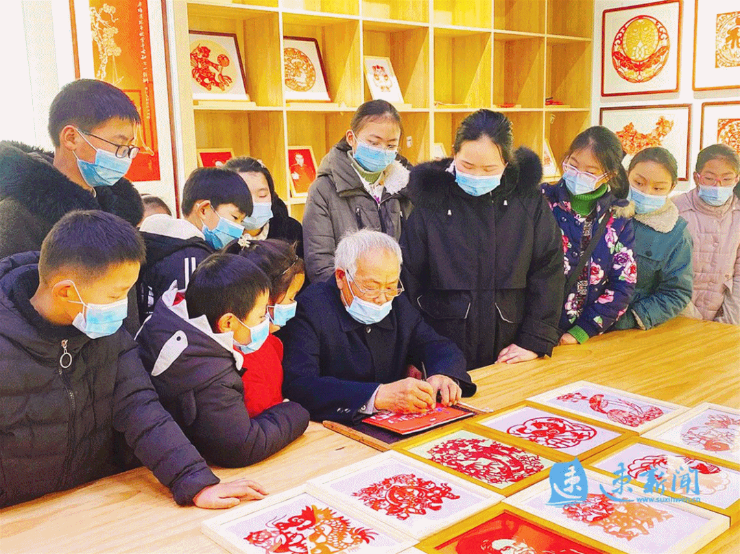 宿遷市非物質(zhì)文化遺產(chǎn)《刻紙門花》項(xiàng)目代表性傳承人蘇立功向孩子們講述“壓歲錢不變味”的意義和重要性,讓孩子從小樹立正確的文明新風(fēng)觀念;