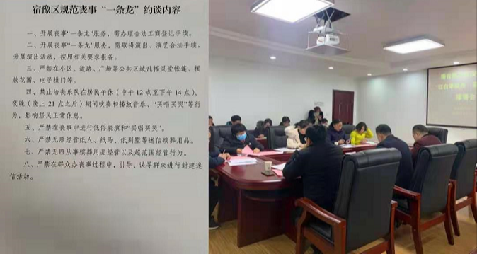 宿豫區(qū)召開“喪事一條龍”培訓(xùn)約談會,規(guī)定“喪事一條龍”服務(wù)內(nèi)容,簽訂承諾書,制定懲處辦法。同時(shí),認(rèn)真落實(shí)“紅白事緩辦簡辦”要求,向?qū)ο矄适轮髯龊眯麄鞴ぷ?,發(fā)出倡議書、簽訂承諾書;