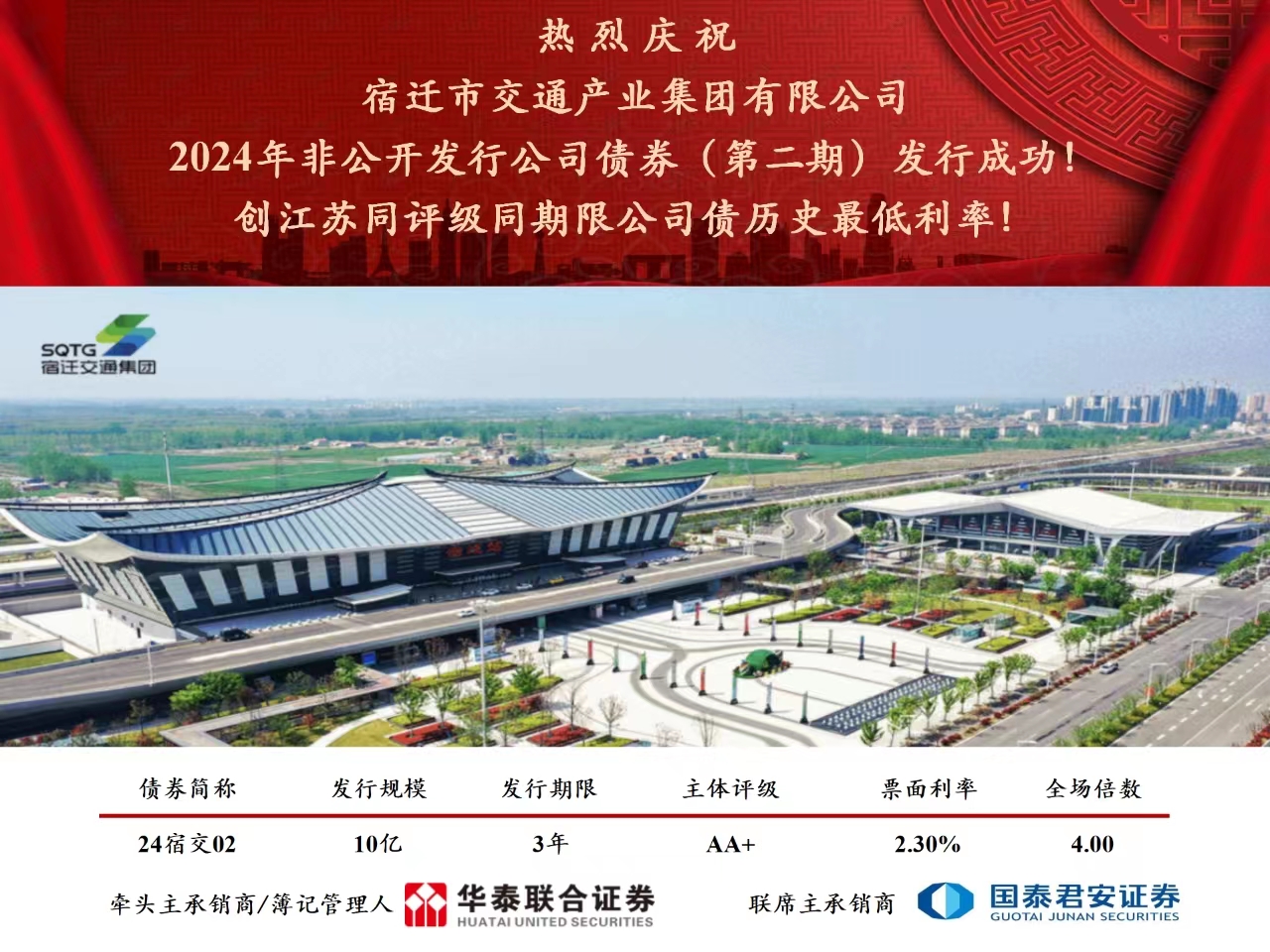 利率再創(chuàng)全省歷史新低!宿遷交通集團2024年第二期公司債券成功發(fā)行