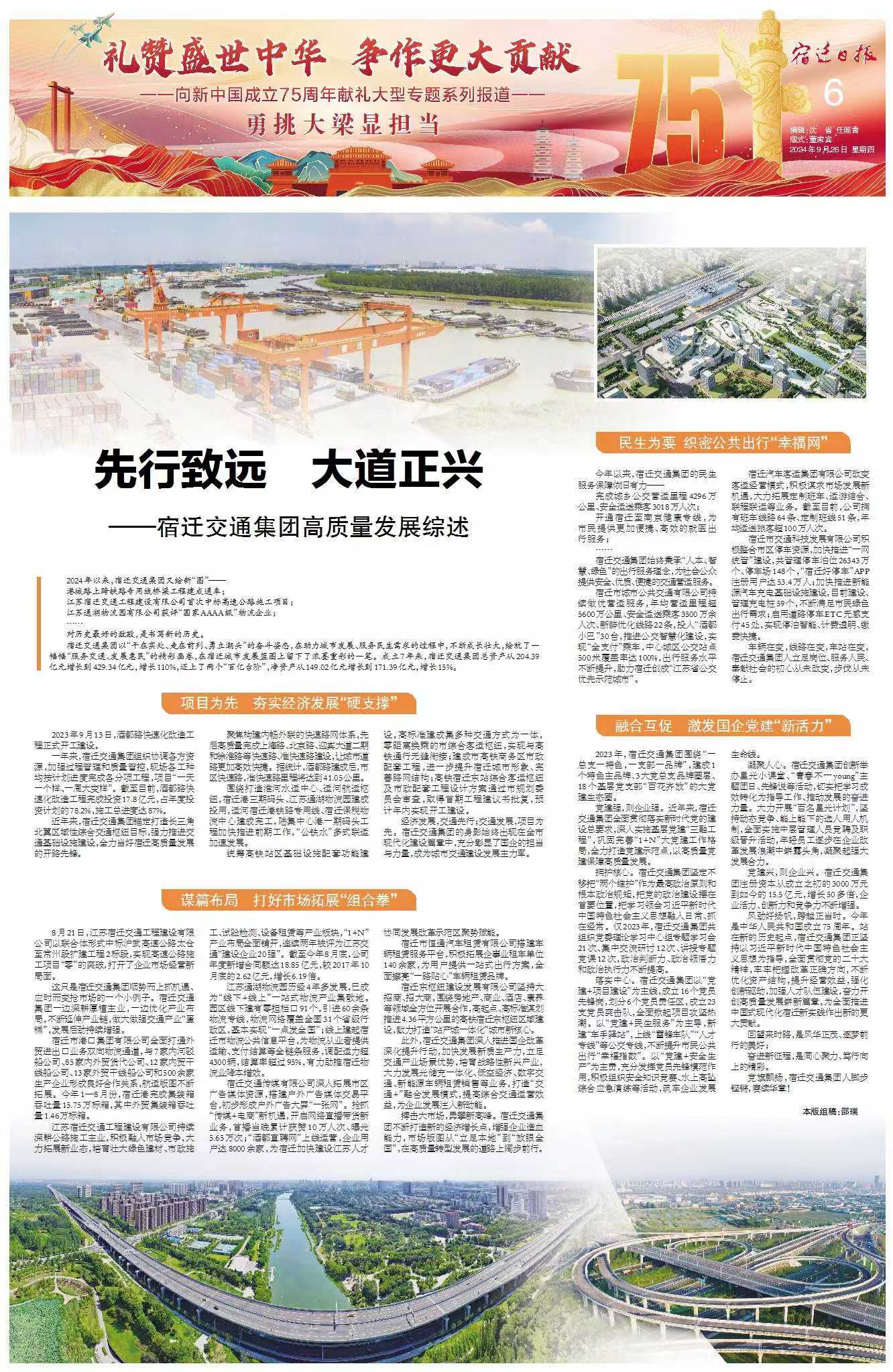 風勁好揚帆,跨越正當時。今年是中華人民共和國成立75周年。站在新的歷史起點,宿遷交通集團正堅持以習近平新時代中國特色社會主義思想為指導,全面貫徹黨的二十大精神,牢牢把握改革正確方向,不斷優(yōu)化資產(chǎn)結構,提升經(jīng)營效益,強化創(chuàng)新驅(qū)動,加強人才隊伍建設,奮力開創(chuàng)高質(zhì)量發(fā)展嶄新篇章,為全面推進中國式現(xiàn)代化宿遷新實踐作出新的更大貢獻。