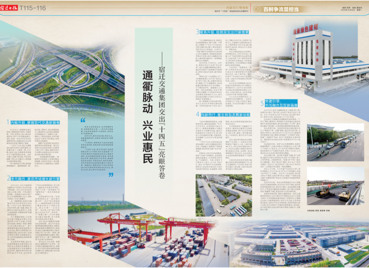 12月8日,《宿遷日?qǐng)?bào)》通版刊登《通衢脈動(dòng) 興業(yè)惠民——宿遷交通集團(tuán)交出“十四五”亮眼答卷》,全方位展現(xiàn)了集團(tuán)“十四五”時(shí)期在項(xiàng)目建設(shè)、市場(chǎng)開(kāi)拓、公共出行、改革發(fā)展、黨的建設(shè)等領(lǐng)域的亮眼成就?,F(xiàn)予轉(zhuǎn)載。