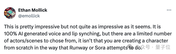 有業(yè)內人士點出,這是100%AI生成的語音和口型同步,而且可供選擇的演員和場景有限。