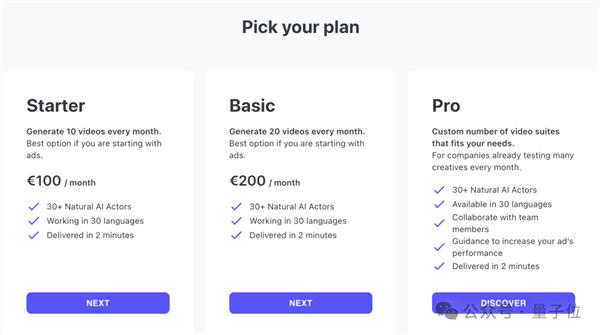 最便宜Starter套餐每個月100歐元,可生成10個廣告視頻,并提供30多個AI演員供選擇。