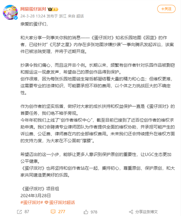 3月28日消息,今日,“網(wǎng)易蛋仔派對”官微發(fā)布聲明,稱《蛋仔派對》知名樂園地圖《因藍》的作者,已經(jīng)針對“《元夢之星》內(nèi)存在多張地圖涉嫌抄襲”一事向騰訊發(fā)起訴訟。